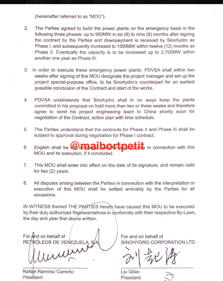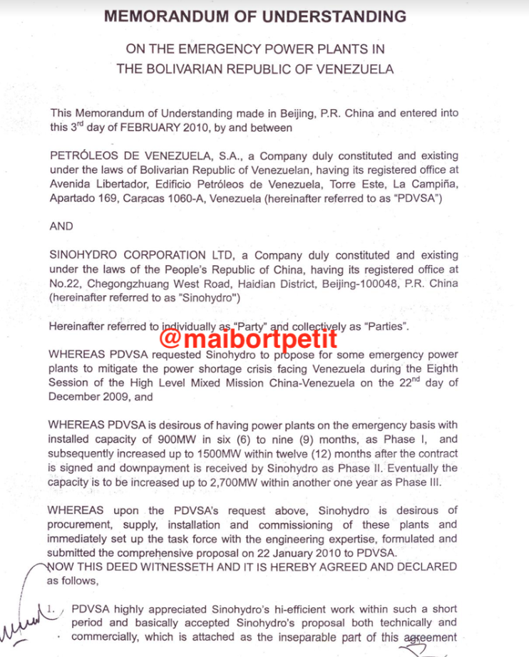 En nuestro poder se encuentra una copia del memorando de entendimiento suscrito el 3 de febrero de 2010 entre Petróleos de Venezuela S.A. (PDVSA) y la citada empresa china Sinohydro Corporation LTD y que sirvió de marco para que tuvieran lugar las negociaciones a que hemos hecho referencia en las líneas precedentes.