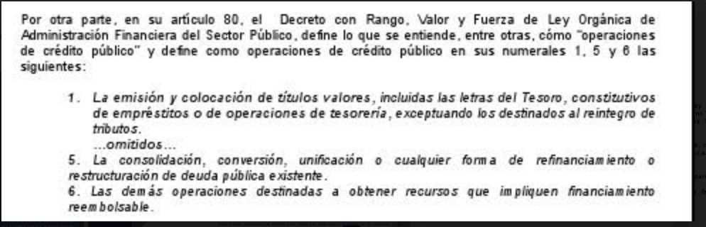 En segundo término se remite al artículo 80 del mismo Decreto-Ley, el cual define las “operaciones de crédito público” en sus numerales 1, 5 y 6, indicando primero, la “emisión y colocación de títulos valores, incluidas las letras del Tesoro, constitutivos de empréstitos o de operaciones de tesorería, exceptuando los destinados al reintegro de tributos”.