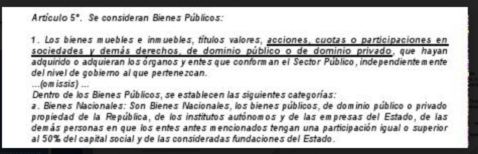 Subraya que las acciones de PDV Holding Inc., de CITGO Holding Inc. y de CITGO Petroleum Corporation, son bienes nacionales de conformidad con las disposiciones del Decreto-Ley que dispone en el artículo 5º que “Se consideran Bienes Públicos: 1. Los bienes muebles e inmuebles, títulos valores, acciones, cuotas o participaciones en sociedades y demás derechos, de dominio público o de dominio privado, que hayan adquirido o adquieran los órganos y entes que conforman el Sector Público, independientemente del nivel de gobierno al que pertenezcan (…) Dentro de los Bienes Públicos, se establecen las siguientes categorías: a. Bienes Nacionales: Son Bienes Nacionales, los bienes públicos, de dominio público o privado propiedad de la República, de los institutos autónomos y de las empresas del Estado, de las demás personas en que los entes antes mencionados tengan una participación igual o superior al 50 por ciento del capital social y de las consideradas fundaciones del Estado”.