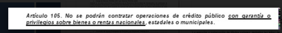 Pasa a considerar entonces, en el contexto del mismo Decreto-Ley, el capítulo IV referido a las prohibiciones en materia de operaciones de crédito público, que en el artículo 105, prohíbe llevar a cabo operaciones de crédito público con garantía o privilegios sobre bienes o rentas nacionales, estadales o municipales. Esta prohibición “ha sido flagrantemente violada por Petróleos de Venezuela S.A. y sus filial PDV Holding Inc.”