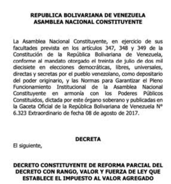 Dentro del conjunto de las llamadas “leyes constituyentes” aprobadas de manera exprés e ilegalmente —la elaboración de leyes es atribución de la Asamblea Nacional— por la irrita Asamblea Nacional Constituyente, figura el Decreto Constituyente de Reforma Parcial del Decreto con Rango, Valor y Fuerza de Ley que establece el Impuesto al Valor Agregado, un instrumento legislativo que busca dotar a toda costa de recursos económicos al quebrado régimen de Nicolás Maduro.
