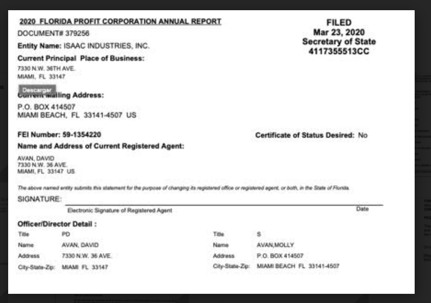 De acuerdo al portal Sunbiz del departamento de estado de la Florida, Isaac Industries Inc. es una empresa registrada en esa entidad estadounidense el 22 de marzo de 1971, bajo el número 379256, FEI/EIN 59-1354220.